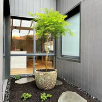 A formerly unused space was transformed into a modern, Japanese-inspired garden by Claire and Deon (@homeforeverhome). The Maple tree is a beautiful feature and the project also included adding James Hardie cladding and spray painting the window frames.