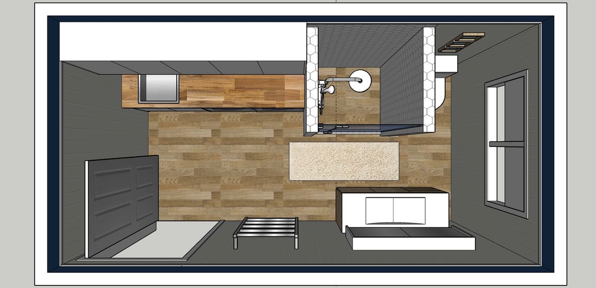 Thank you for your patience. Here is one idea that you might like, however, I had to take the bath out so that it won't look too crowded. Please have a look at the sketches and tell me what you think. If you wish to see it in another configuration, please let me know.