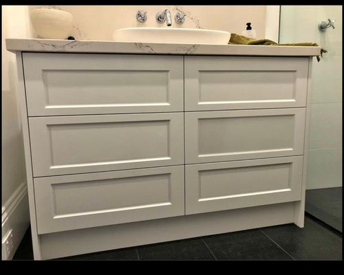 I would also like to create a vanity with an integrated front loader washing machine. To do this, I would like to use a kaboodle timber bench (havea timber). I have 6 drawers fronts ( each measuring 583 x 223) and end panels that I can use but would need to purchase internal carcass and I would love some advice on what I should be purchasing. I will include a photo of the drawers (photo is of vanity but I only have the drawer fronts and end panels) and a photo of what I have in mind for laundry/vanity.