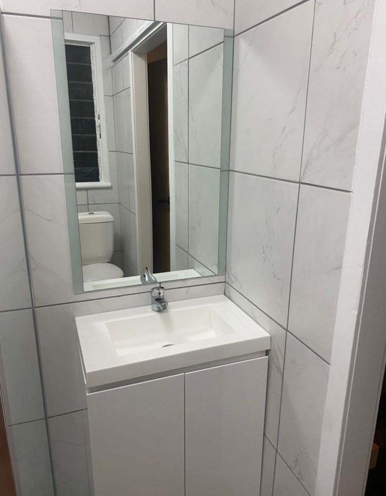 New shower door, vanity, mirror, towel rails, taps. Tiling