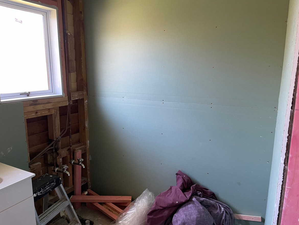 To date, we've done a fair amount of work. We've GIBbed as far as we can. We're waiting on the plumber, but before that, we need to get our bath. Hopefully, it will be here on Monday. Once the bathtub is in, the plumber can move the taps to fit the new ones coming in November. He can then tell us what we need to do to cut drains and move the pipes for the new shower area. Once the concrete gets cut, the plumber can come back and do the pipework. Once the pipework is complete, we then batt and GIB, and the plasterers can finish off.