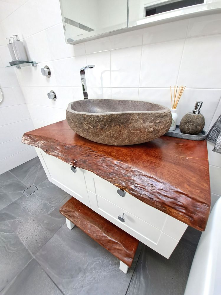 I wanted to add a natural element, so I found a bloke who had this 50 year old Redgum slab in the back of his work shed. That, with this cool stone basin, I was able to make a one of a kind live-edge vanity unit.