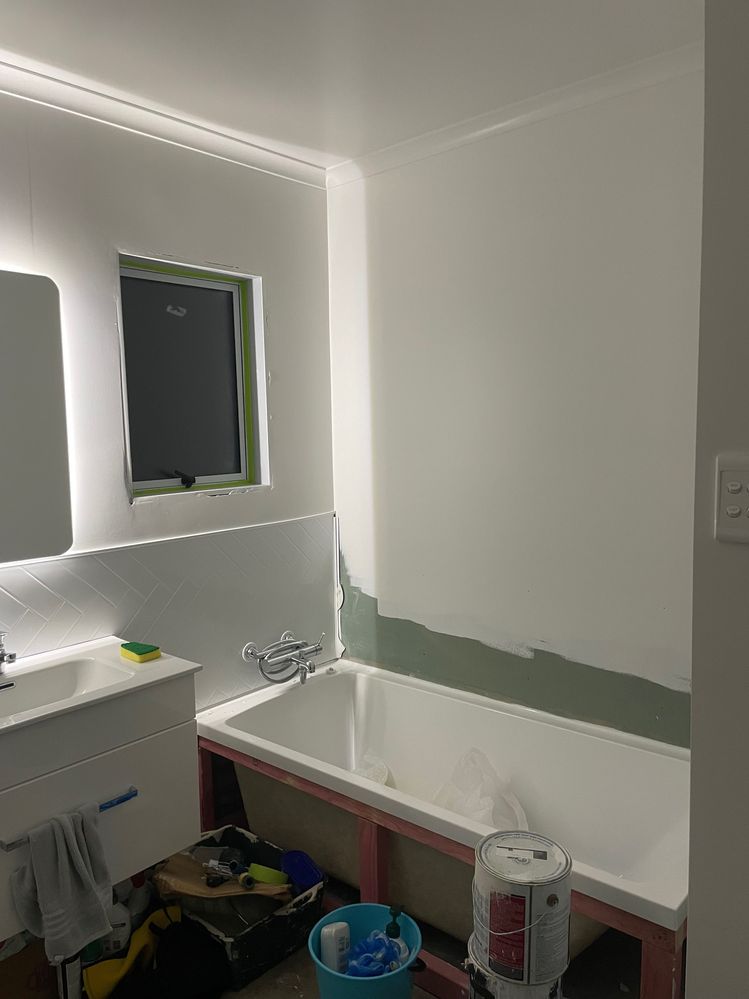 We had already done two walls in order to get the plumbing done. In the end we got a tradie in to do the rest. I kind of wish I had done it because there was a couple of spots that he messed up. It's noticable if you're looking for it but not too bad.