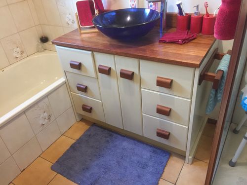 The drawers and doors are made from a Bunnings pine panel. The top is made from a Bunnings Merbau timber bench top. The drawer pulls are also made from the pre-made bench top. The drawers and doors are painted to contrast with the existing bath and wall tiling. The short rail for the hand towel is also made from solid Merbau.