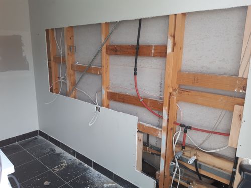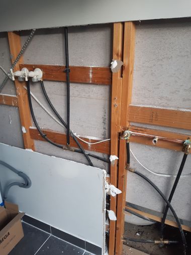 We will be getting a plumber in to relocate the water pipes to under the sink cabinet and this will involve cutting the wall sheeting away where the splashback will be going.