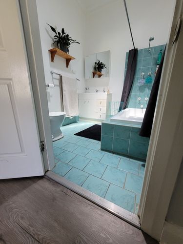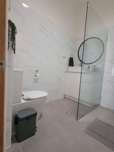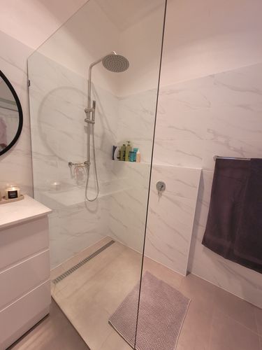 In terms of budget, it was tight but includes trades, we had to forgo some things like a new vanity (I bought the unit and basin on marketplace, it was practically brand new but half the price!) to allow for larger expenses ie; trades. however my partner is pretty handy and was able to do all the demo, simple plumbing, building the nib walls and the new door jam as we changed the door to open inwards rather than outwards. Our tiler waterproofed the entire area, 3 layers took over three days to dry! (We had snow for a week while he was here!!) He charged us just under $3k he was here approx 8 days to complete the whole thing. He did wonderful job however I wish now we'd gone one tile height higher only for aesthetics, we went to 2.4m but our ceilings