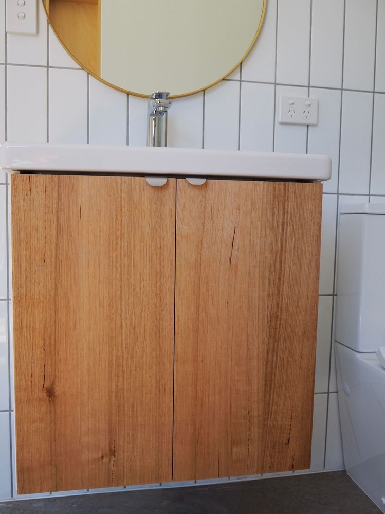 Nice vanity units are so expensive! Heres a little hack to make your own that looks good and doesn't break the bank. I bought a standard vanity cabinet carcass from Ikea, took the measurements of the doors in store (you usually buy the doors separately), and made my own doors out of Tasmanian Oak. You can do the same with any flat pack carcass brand. The process I used to make the doors is the same as shown in the cheese board DIY guide, except I cut to size using a table saw. I'm pretty happy with the result!