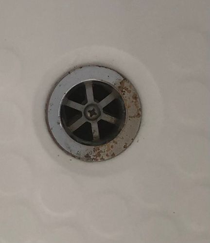 My bathtub drain (plug hole) is tarnished and lost colour. It almost looks like something has eaten away the silver coating. I have tried a variety of cleaning products which haven't worked. Is there anyway to remove the drain fitting and replace it? Or will my only option be to spray paint silver? The screw showing does nothing to remove it.