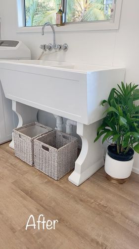 Removed old laundry tub and resurfaced a double cement tub using Dulux Aqua paint.