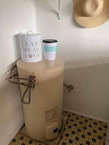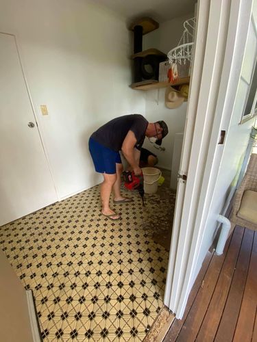 We added a kaboodle bench and bamboo bench top for storage and work surfacce. Hung timber Ladder from wall for drying and replaced tiled floor with vinyl planks.