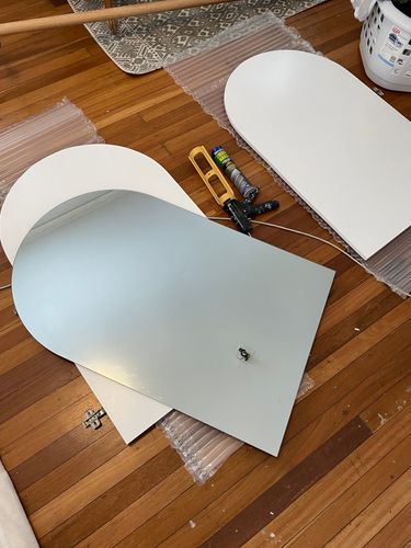 I added tape and then traced around the mirror onto melamine and cut the arch shape using a jig saw and the right blade for melamine.