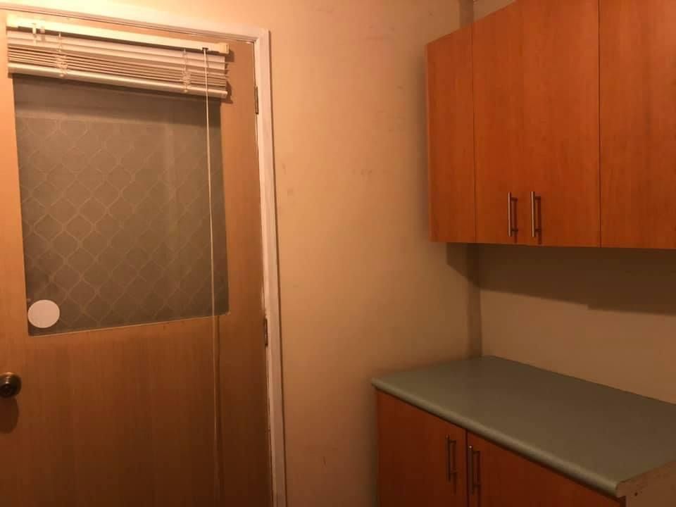 Emptied out the laundry and cleaned all of the surfaces. Removed the washer, dryer and appliances. Pulled up the existing laminate floor tiles and cleaned the floor.
