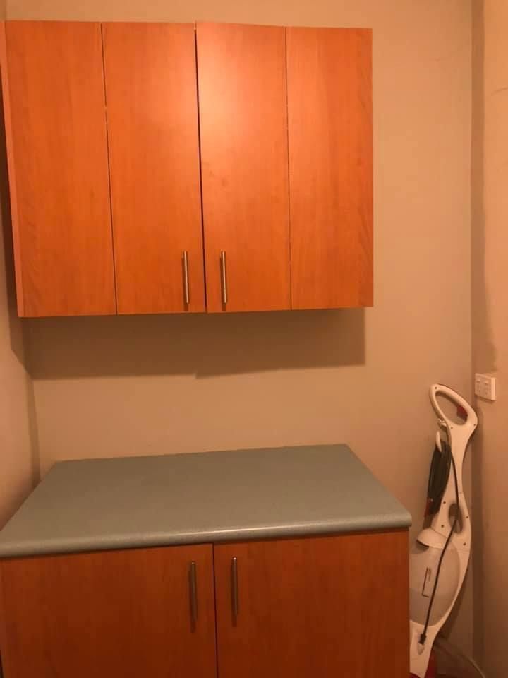 Installed a new broom cupboard, in the vacant space next to the bench and upper and lower cupboards. Cut out a hole on the wall side within it, to access the powerpoint there.
