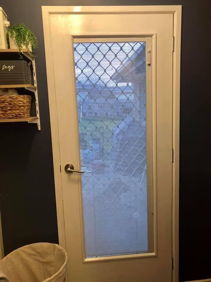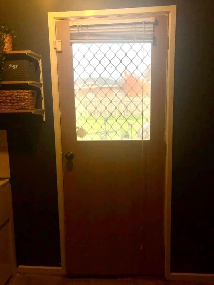 Replaced the old external door with a new Corinthian door with an internal venetian blind between its two glass window panes. Primed it, then painted it white.
