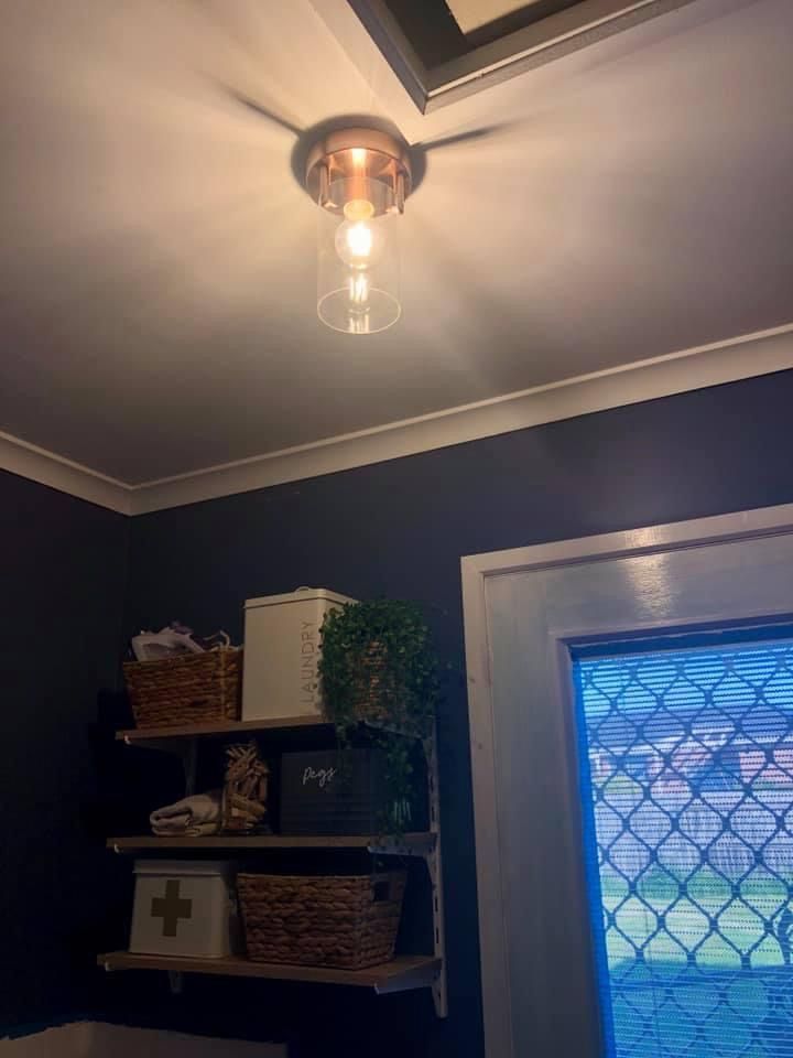 Prime & painted all of the interior walls midnight blue, and the sink's backsplash tiles, the ceiling and the laminated benchtop all white, with 3 coats each. Added a new ceiling light fixture. Swapped out the sink wall tap set and spout.