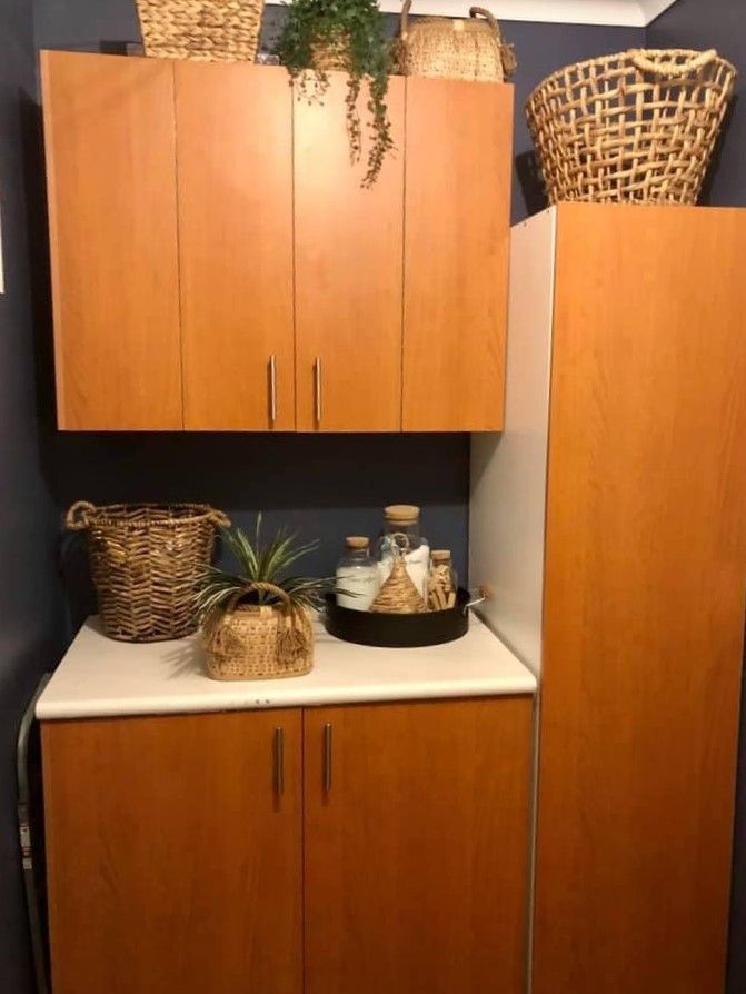 Placed a bamboo cutting board over the sink for more 'bench' space to put a washing basket on, or to fold clothes. Added the extendable curtain rod between the dryer and the wall, tensioned it, then hung the wooden coat hangers. Brought in woven washing baskets, the ironing board & iron basket holder, laundry powder box, glass jars for laundry products, serving tray, wicker baskets, peg holder caddy, door stop, pictures, first aid box, artwork, faux plants and other accessories for styling. Added a magnetic caddy to the side of the washing machine for additional storage. And...voila!
