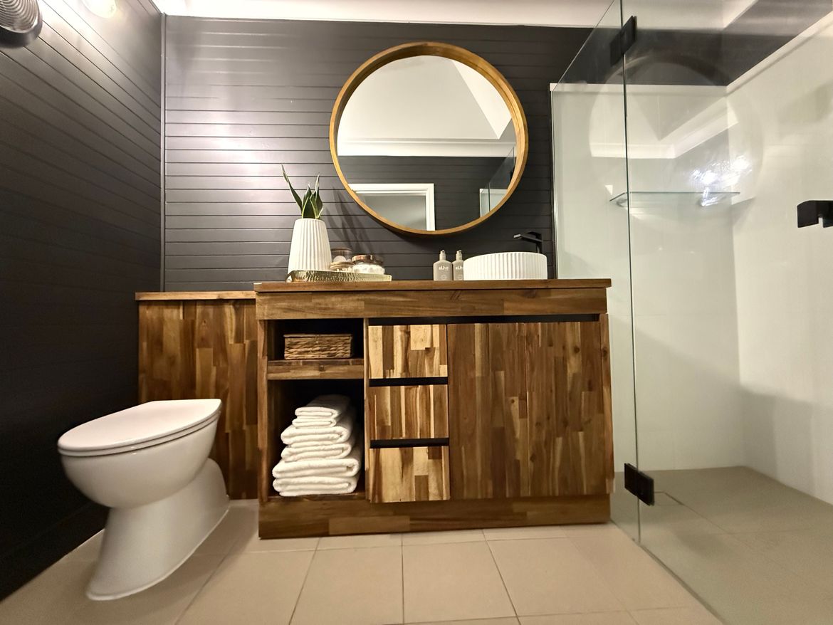 This revamped ensuite is a beautiful example of how thoughtful updates and smart recycling can completely transform a space without needing to start from scratch. The use of natural wood for the vanity adds warmth and richness that contrasts perfectly with the dark vertical panelling, giving it a modern yet grounded feel. The round mirror softens the space and complements the curved basin and sleek black tapware, while the neutral tiles you chose to retain now act as a calm, timeless foundation. It feels fresh, elegant, and purposeful, like every piece was chosen with intention, and the overall result is effortlessly cohesive.