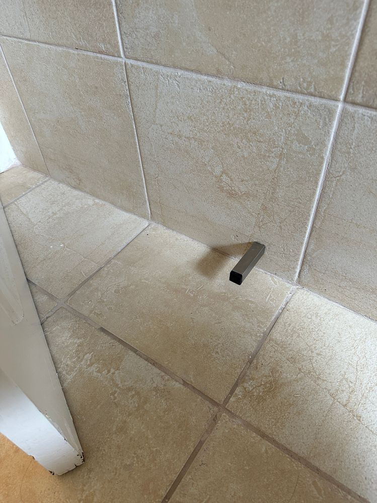 This was the existing state of play. In the first week of moving into our unit, we quickly set up two wall mounted hooks. Existing was a small towel rack, and an ugly bolt that has been painted over.