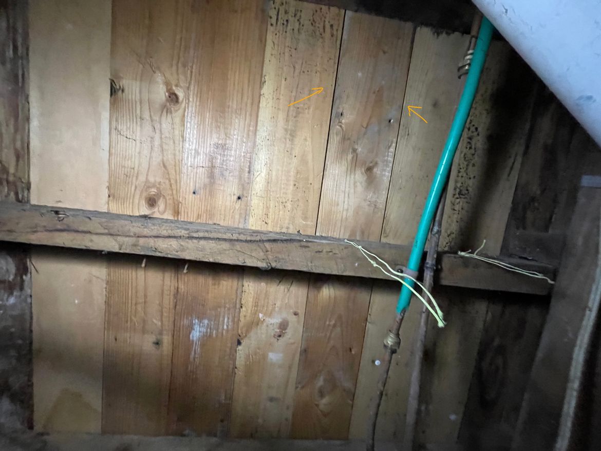 I went for a bit of a crawl and got the below pic - the orange arrows point to the board with the gaps (the lighter board in the earlier photo). Doesn't seem to be any signs of water damage or leakage. Also revealed that the boards here seem to be newer than the boards in the rest of the bathroom (you can see one of the older boards on the left in the image below are much darker and have old water stains).