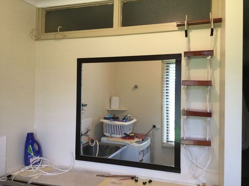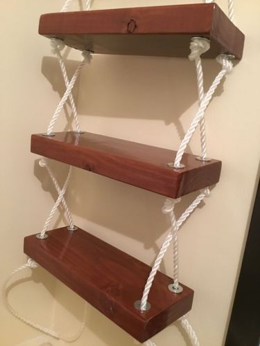 I have a boring wall with no character, I recently to a mirror off a dresser, which I siliconed to the middle of the wall and added a frame which I painted. No I had an issue, both sides of that mirror lacked something. So I designed, upgraded and made two hanging rope shelves which I stained a beautiful mahogany. It sure made a boring wall look much more inviting.