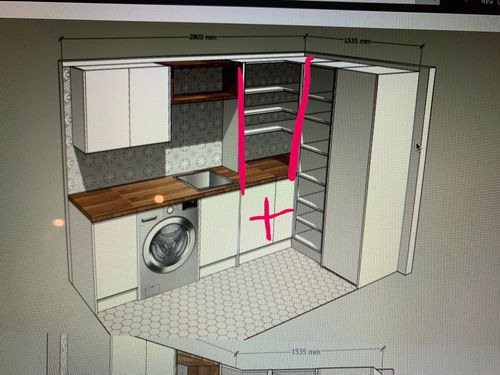My apologies for the late reply. Your pantry/laundry has so much potential! Thank you for posting some sketches of your plan. Looking at your proposed layout, I think there is just enough space to squeeze a broom cupboard in. If you are removing the laundry tub, I suggest placing the washing machine on the left-hand side of your laundry tub. This will allow us to maximize your pantry space. The hoses for the washing machine can be trailed along the bottom of the benchtop and then back up to the original position of the washing machine taps, there will be no need to move them.