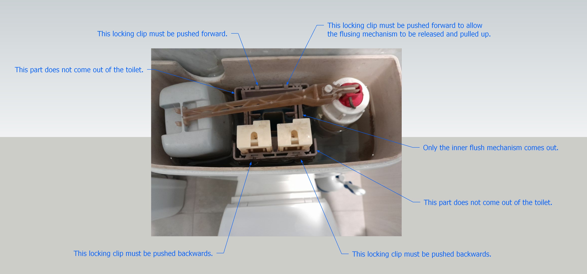 I suggest having a quick look at this discussion - Solved: Installation of dual flush valve in Caroma cistern - Page 2 by @Pwsingh. There is a general description of how the flushing mechanism can be unhooked. I've also placed an image below to give you another general idea of how the flushing mechanism can be removed from cistern as well.