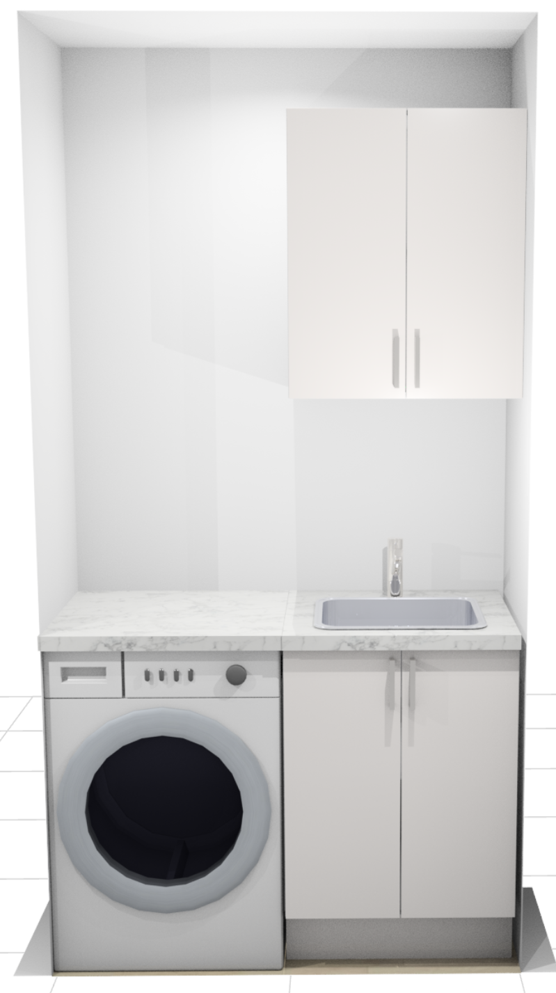 Could you provide a few more details about the area you’d like to dedicate to the laundry? Is it just the little alcove you currently have, or are you open to using some of the wall space to the right as well? If you can draw a simple diagram showing the footprint, including wall positions, dimensions and the space you want for the laundry, we can put together a more tailored design for you.