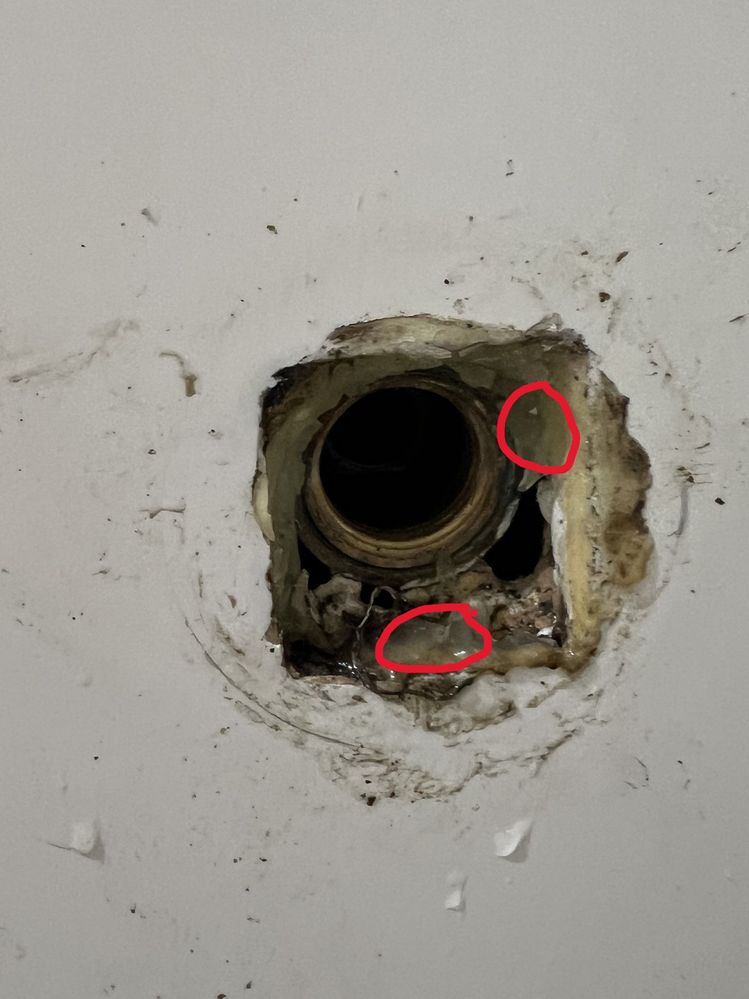 That would likely be clear wet area silicone, which you can apply with a caulking gun. Ensure you fill those gaps where you can see into the wall cavity.