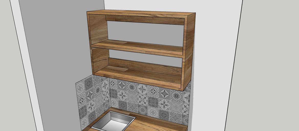 Here is another version of Mitchell's proposal but with a timber benchtop and shelf. The benchtop is the Specrite 2200 x 600 x 26mm Timber Multi Use Pine Panel. If you are using the Kaboodle 450mm White Base Cabinet the length of the panel should be more than enough to create a waterfall feature. If you purchase another panel, you should be able to create an open cabinet to mount on the wall. The sink is the Estilo Stainless Steel Single Bowl Square Sink.