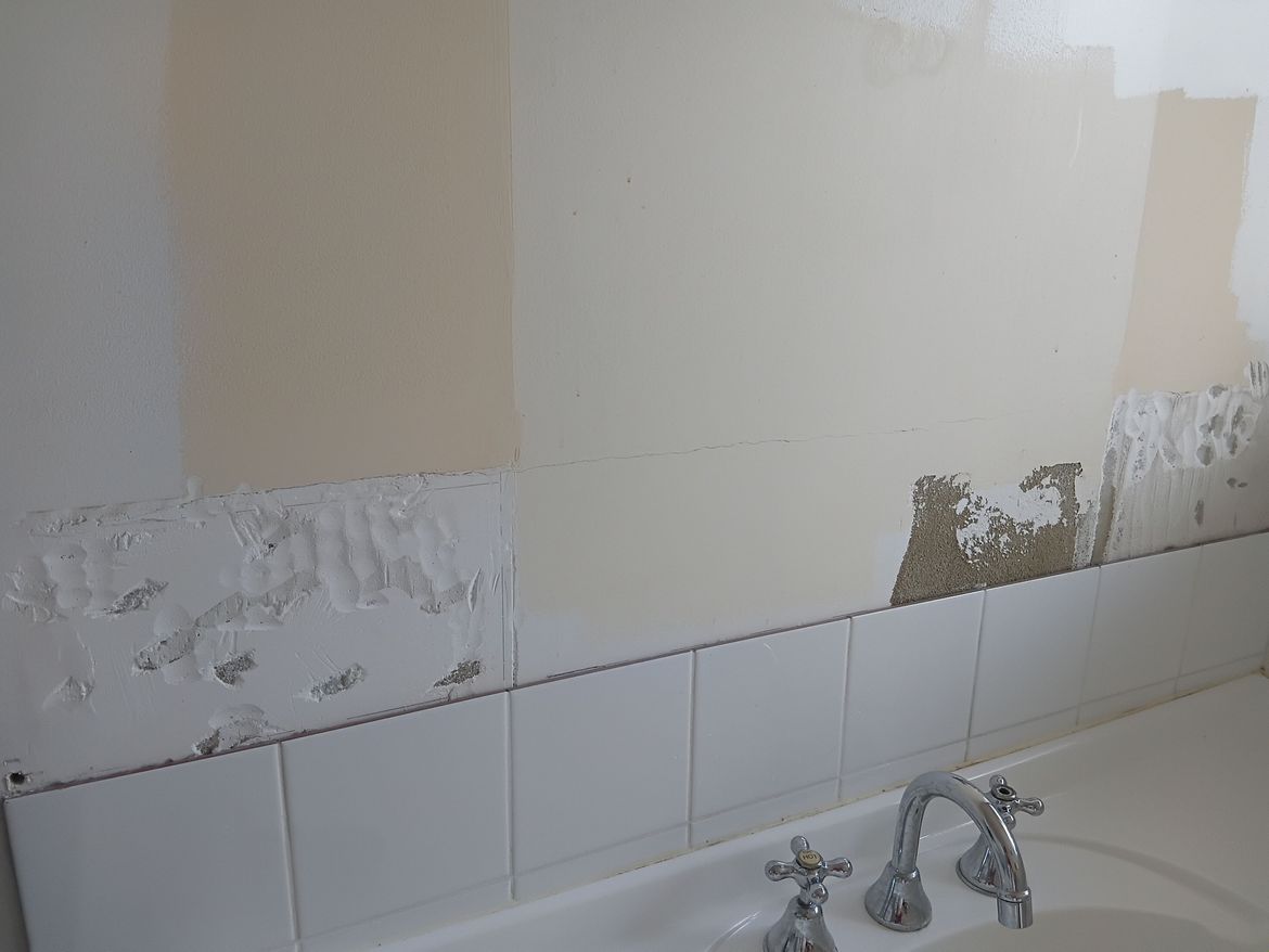 I also took the mirror off the wall today and underneath it looks like this. Any ideas on how I can level this so I can paint it?