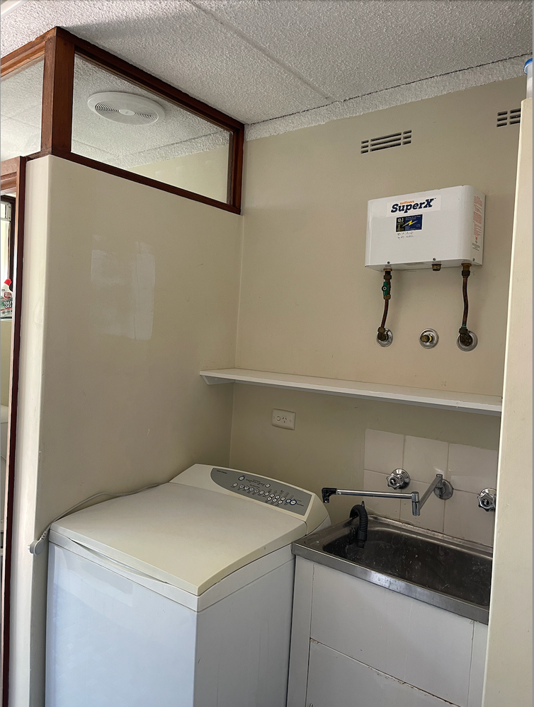 I'm wanting to convert this section of my units combined laundry & bathroom space to have a bathroom, vanity, sink and mirrors. Someone in a similar unit, with the same dimensions as us has done this but I can't work out how they have concealed the water system, I was thinking we could use a shaving mirrors systems to conceal this.