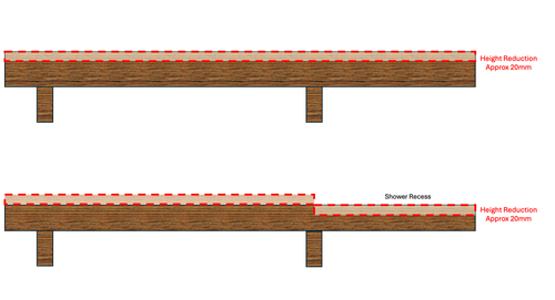 1. Take up floorboards in the area of the shower in order to drop the floor and install noggins to accomodate shower tray, and lay 6mm Hardie backer board across the whole floor, before water proofing and laying tiles.