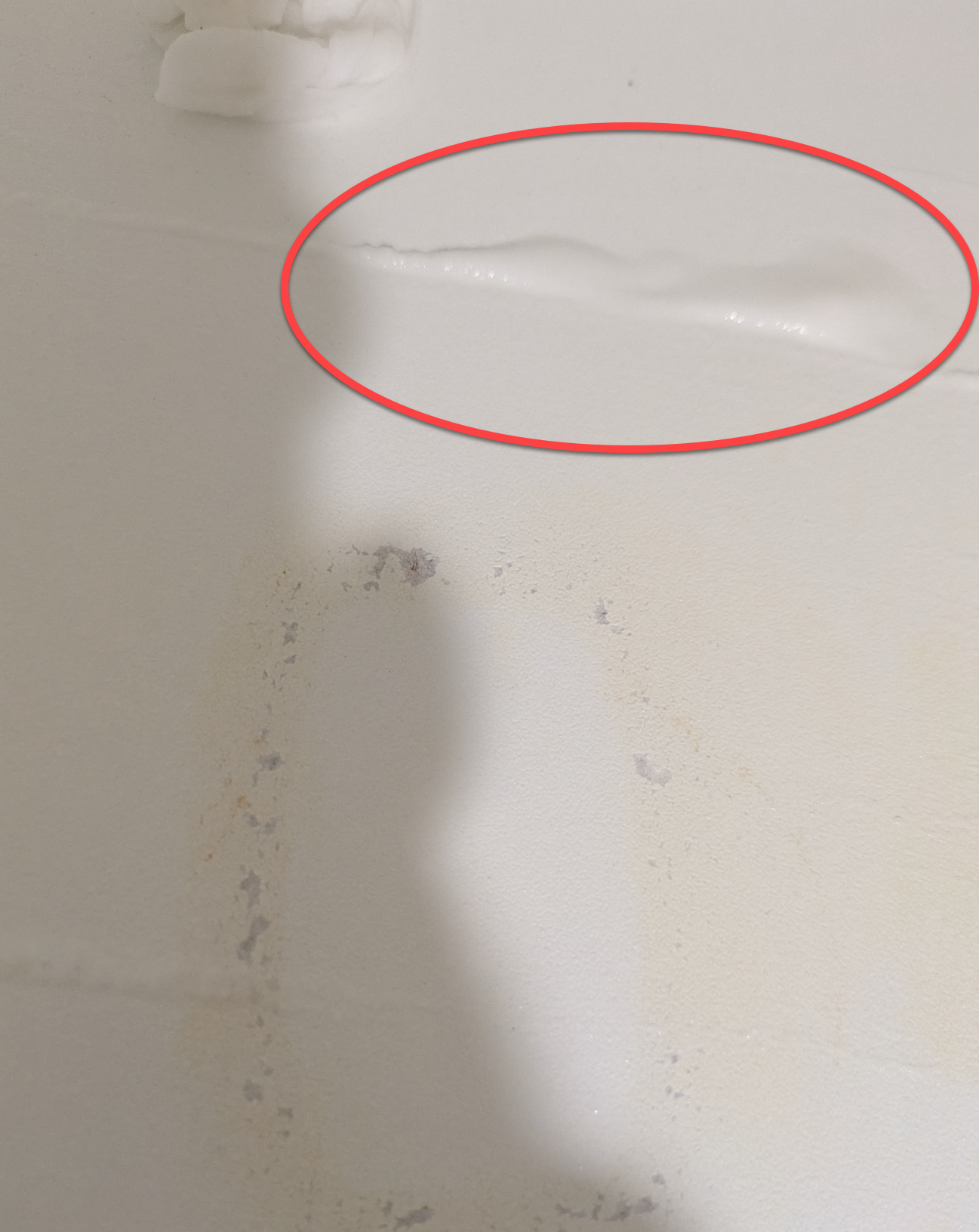 Thank you so much for your response, Unfortunately I am not currently at the unit but I had a stain that most probably was caused by laundry liquid and left a yellow stain. I used wet wipes first, then I used white king - mould soap scum remover, then applied baking soda and vinegar. After scrapping it, I noticed this damage. The paste you see in the photo is the baking soda and vinegar. This mix helped but needed a softer scrap.