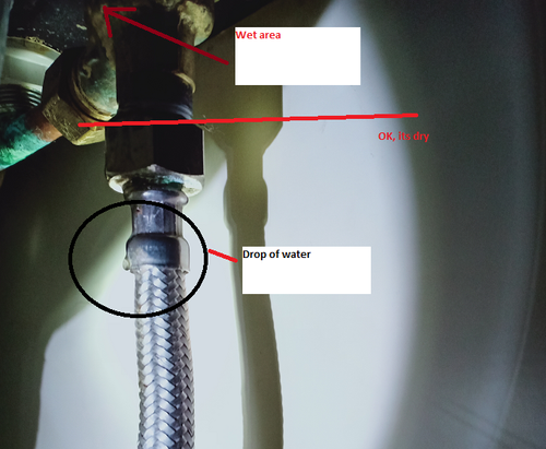 Have tighten the nut where the drip was, however, noted that the drip was at the bottom of the hose as below. Suspect it originates from the wet area at the top :- Could that be washer issue or other?? If to change the hose, is it a big job?