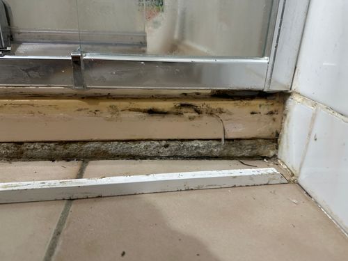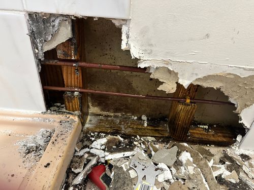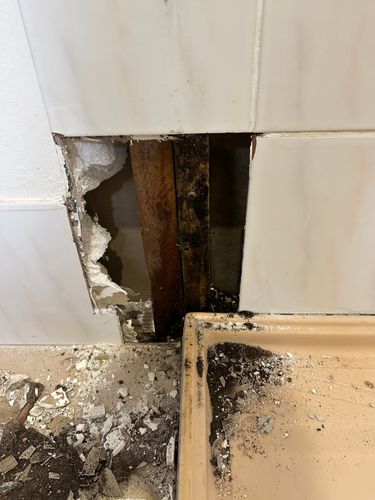 Today I removed the tiles on either side and as I did so my chisel went easily through the gyprock underneath once I got through the grout. Once I got the tile off, the remaining gyprock was so damp it broke apart with minimal pressure. Behind, the wall stud and bottom plate were also damp and rotting. I haven’t taken all the tiles off but I’m thinking that I’ll find similar issues along the shower base and that the previous owners had just siliconed over a previously failed seal. I’ve noticed the start of some mould so I have sprayed the area with mould killer.