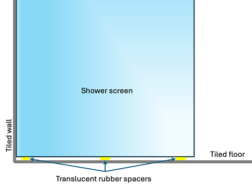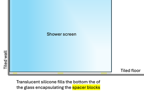 Depending on glass length, two or more small rubber mounts/spacers about the thickness of the glass and a few mm high which sit under it. The weight of the glass hold them in position. then the cap is filled with the translucent silicone which is what secures the glass to the floor. Some shower screen sit inside a channel which is fixed to the tiled floor. But yours appears to be glass to tile which is the cleaner method.