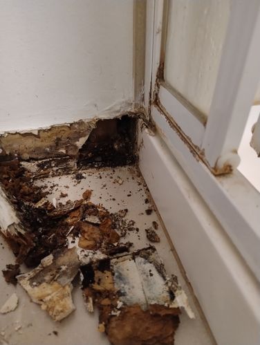 Unfortunately, this one doesn't look like there'll be an easy fix and will likely require extensive remediation work and the assistance of suitably licenced tradespeople. You can see where I've circled in the below photo that the water has gotten in and is rotting the bottom plate of your wall.