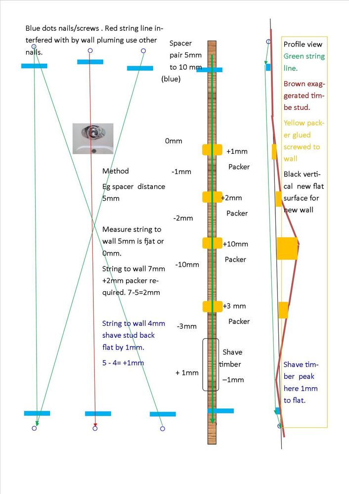 Now measure from the string line to the wall or wall stud timber.  EG  5mm spacers ( this means subtract 5 mm  off your measurement  of 5mm and that is a flat wall spot no spacer required. 5mm- 5mm is  zero)  ok  wall is flat at that spot .  If you measure  8mm that means the wall or stud is moving away (bowed inwards from straight  by 3mm  (8- 5mm space is +3mm  that  means add 3 mm spacer here (Tip write this +3 on the wall as you go. ) The more  timber in the wall the more places to  fix more shim glued and screwed the more packer points the firmer the wall this dosnt matter if wall has only studs or a pre existing wall. (Preexisting wall find studs to do string line and attach packers too) If you have a 5 mm spacer and you measure 3mm that means the wall is bowing outwards 5- 3= 2mm and you can shave the  extra 2mm off to return  the wall to flat. 0mm . When you lay your new sheet it should be very close to flat.