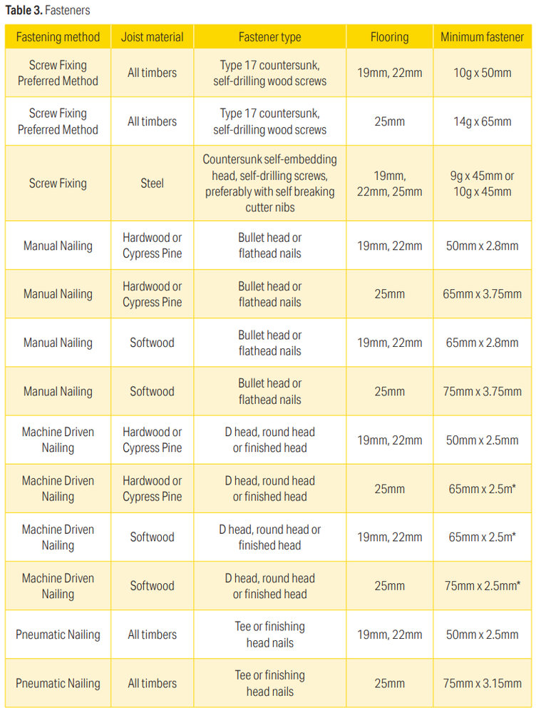 There are different requirements for the various thicknesses of structural flooring and the type of joists you have. Details below.