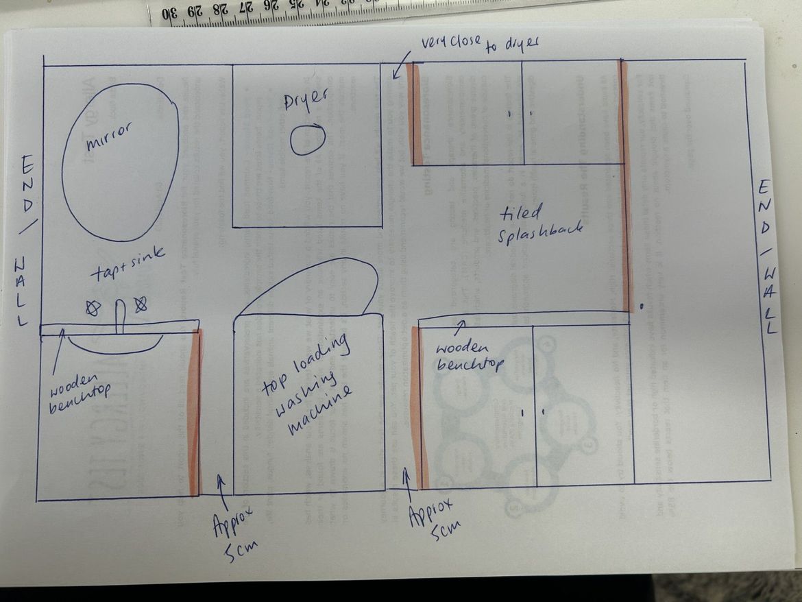 We're installing a new laundry and we're using Kaboodle cabinets and alpine profile doors raw, so I will paint them myself. The layout which can't be changed, has multiple 'ends'.
