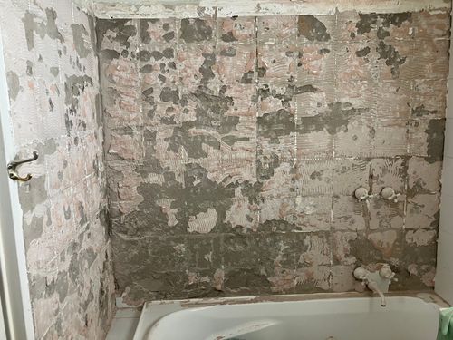 Note that the waterproofing needs to be done around the bath and on the flat tiled surface on the left. I would think that the tub really needs to come out to waterproof and tile the walls.