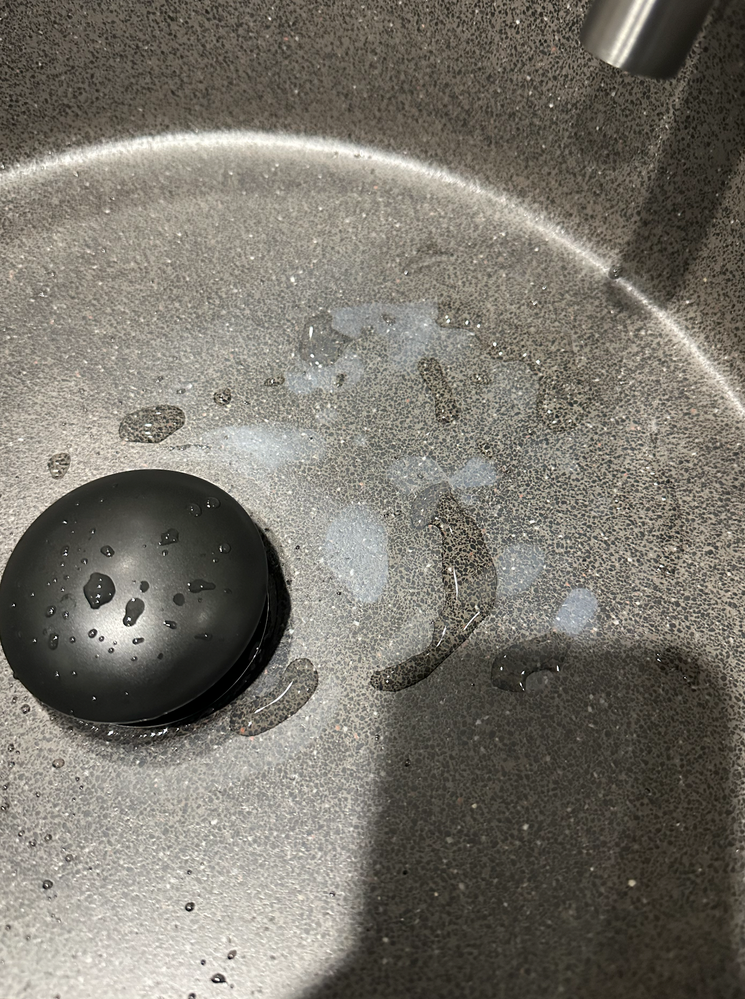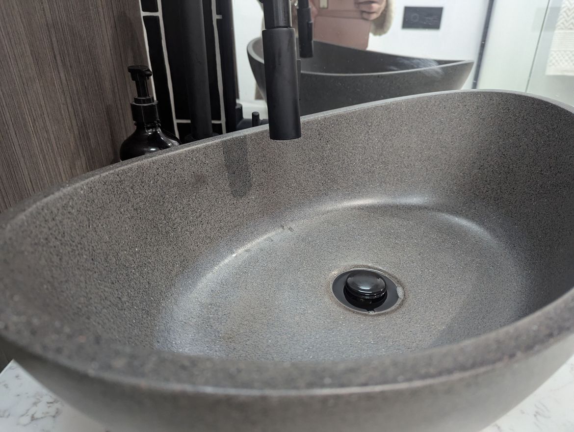 Did a small facelift on the bathroom the other day, including installing a new concrete sink, a Mondella one, from Bunnings. Looks great but I after running some hot water for the first time, white stains appeared on the sink. It’s not silicone or some other product that could have stripped the finish or left residue (I was extremely careful, wearing gloves, etc.). The stains go away when soaked with vinegar, or generally when they become wet, but return when the sink goes dry.