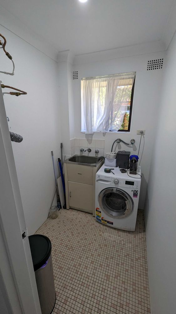 My partner and I live in an apartment and this is our small laundry that we're wanting to do a makeover on. We have already purchased some stick on floor tiles because we don't want to deal with replacing the tiles at this stage. We also aren't in a position to re-arrange the position of the taps or HWS.