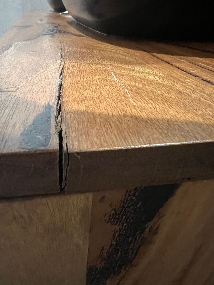 There is a possibility that the benchtop can be restored, depending on the extent of the damage. One approach would be to carefully remove the benchtop, then glue the crack and clamp it back into position to close the gap. Once the crack is sealed, the entire surface would need to be sanded smooth to eliminate any rough spots. Another option might be to fill the crack with black-tinted epoxy, which can provide a strong, durable repair and blend well with the wood’s natural grain. After either method, the benchtop would need to be refinished with a new protective coating.
