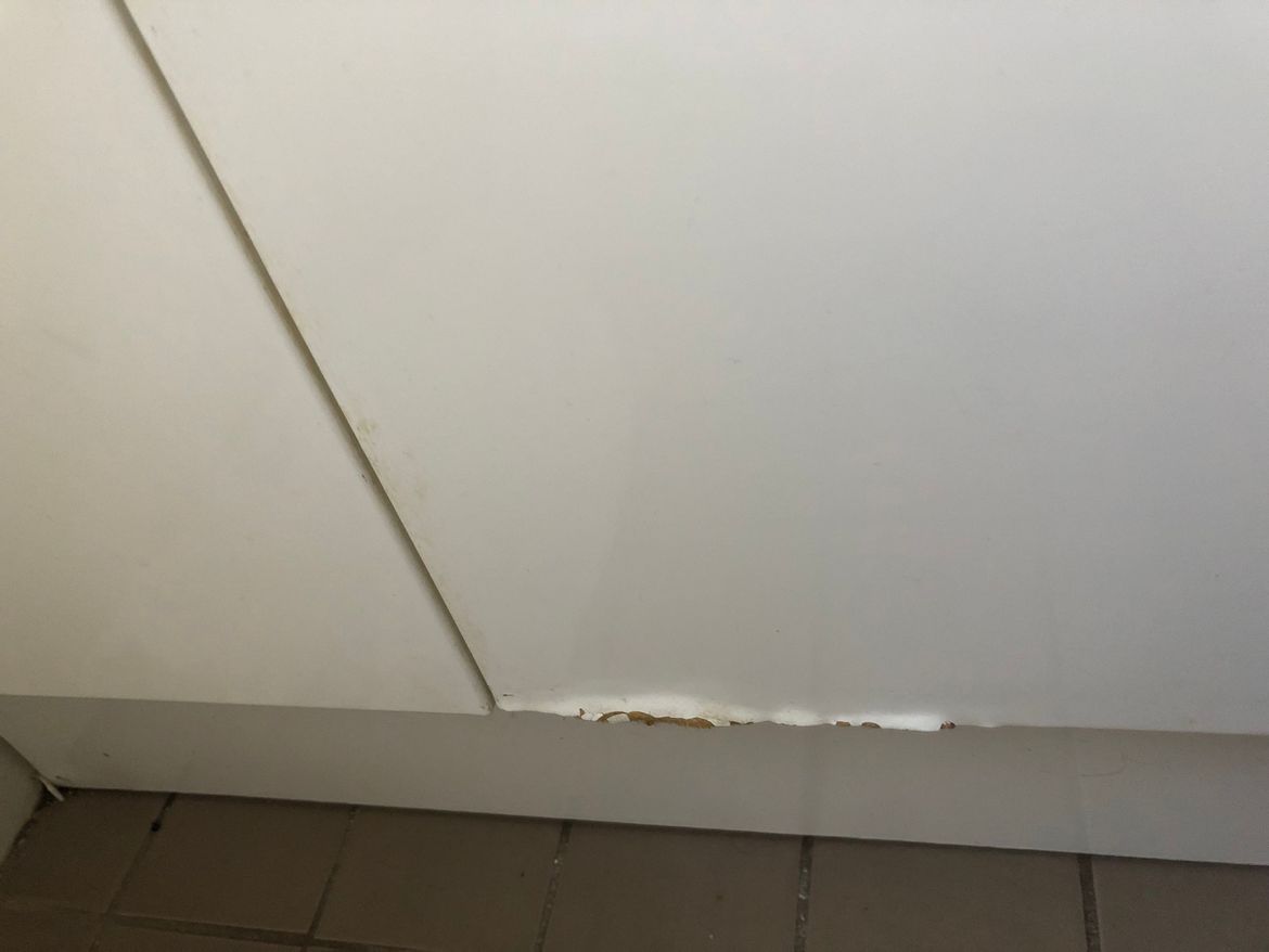 Can anyone suggest something simple and easy I can do about the curling on the bottom of our bathroom vanity door?
