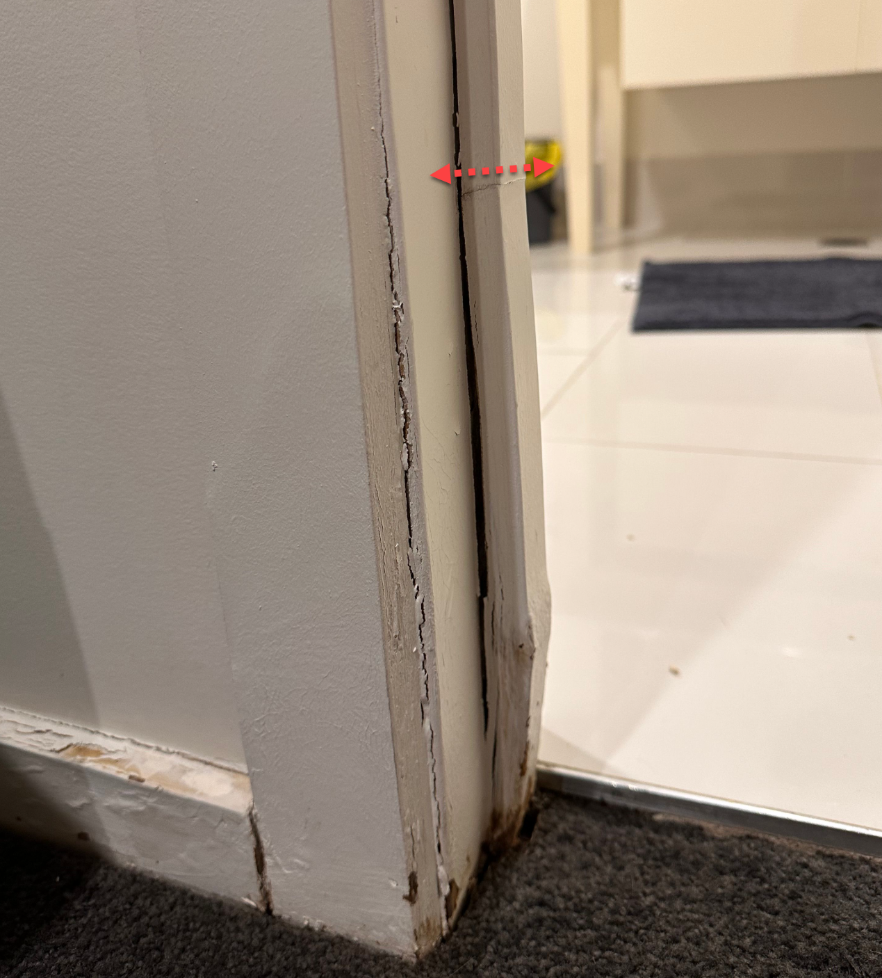 There was a leak from shower last year which has been resolved. 6 months later, I would like to see whether this door frame can be fixed? It looks as though the previous owner tried to fix it before as I could notice there was a line and color difference in the door frame.