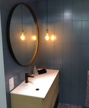 In terms of lighting, we have got a black led + fan square in ceiling fitting, a single HPF heat lamp (it's not near enough, even in this little room! I'd recommend a double lamp), an above mirror makeup light and then the little pednant with a decorative 3w globe from bunnings. This pendant is great for midnight bathroom trips without blinding you.