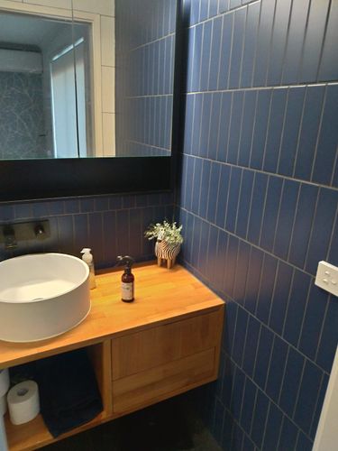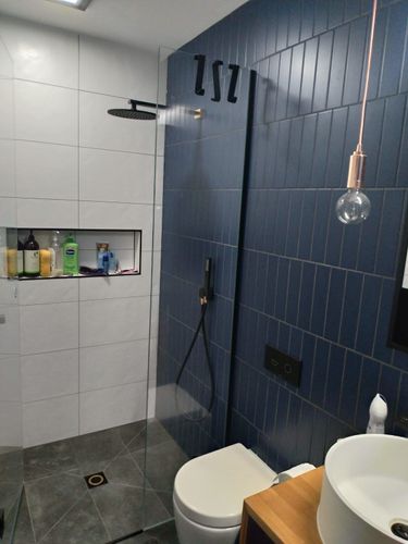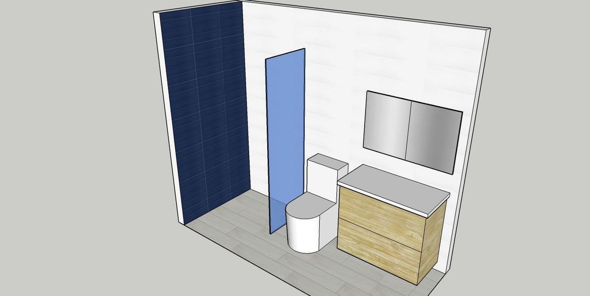 Here are a few renders. The tile colors are not 100 percent accurate but you get the idea once it has been laid out. I suggest a square skylight near your shower. This will help alleviate the darkness within the bathroom and you wont have to turn on the light all the time you have to use the loo, it will also help accent your beautiful blue matt tiles that you have chosen. If it is too dark in the room the tiles loose their effect. Your black in wall mirror cabinet will loose its impact as all you can see from it is the black edge. But if that is the effect your going for then we shall leave it as is.