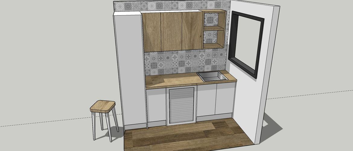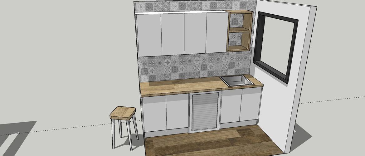 One thing I forgot to mention, there's a raised concrete platform in the corner beneath the cupboard, where our hot water system used to be. Any ideas on how to hide this? E.g. would it be possible to assemble a pantry over it?  It measures approx 60cm X 70cm.