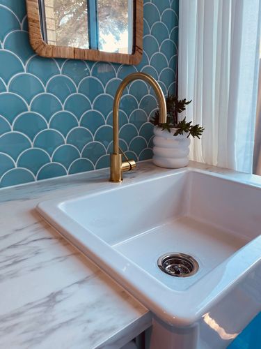 What an absolutely stellar transformation! I can see why you are in love those tiles; I am too! The cabinet hardware is a great choice and complements everything nicely. The Farmer's sink is just the icing on the cake. You've got a keen eye for matching the sink tap with the cabinet handles; many people miss this key detail.